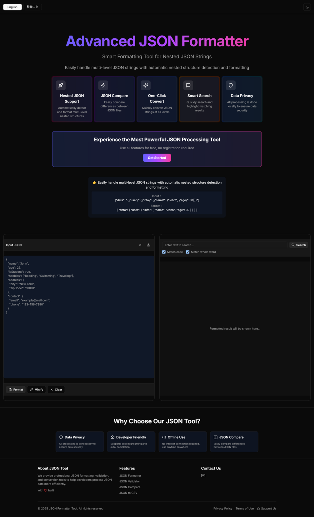 - Plug-and-Play Efficiency: Say goodbye to lengthy development cycles. Our template is ready to deploy, allowing you to launch your JSON formatter website swiftly and efficiently.